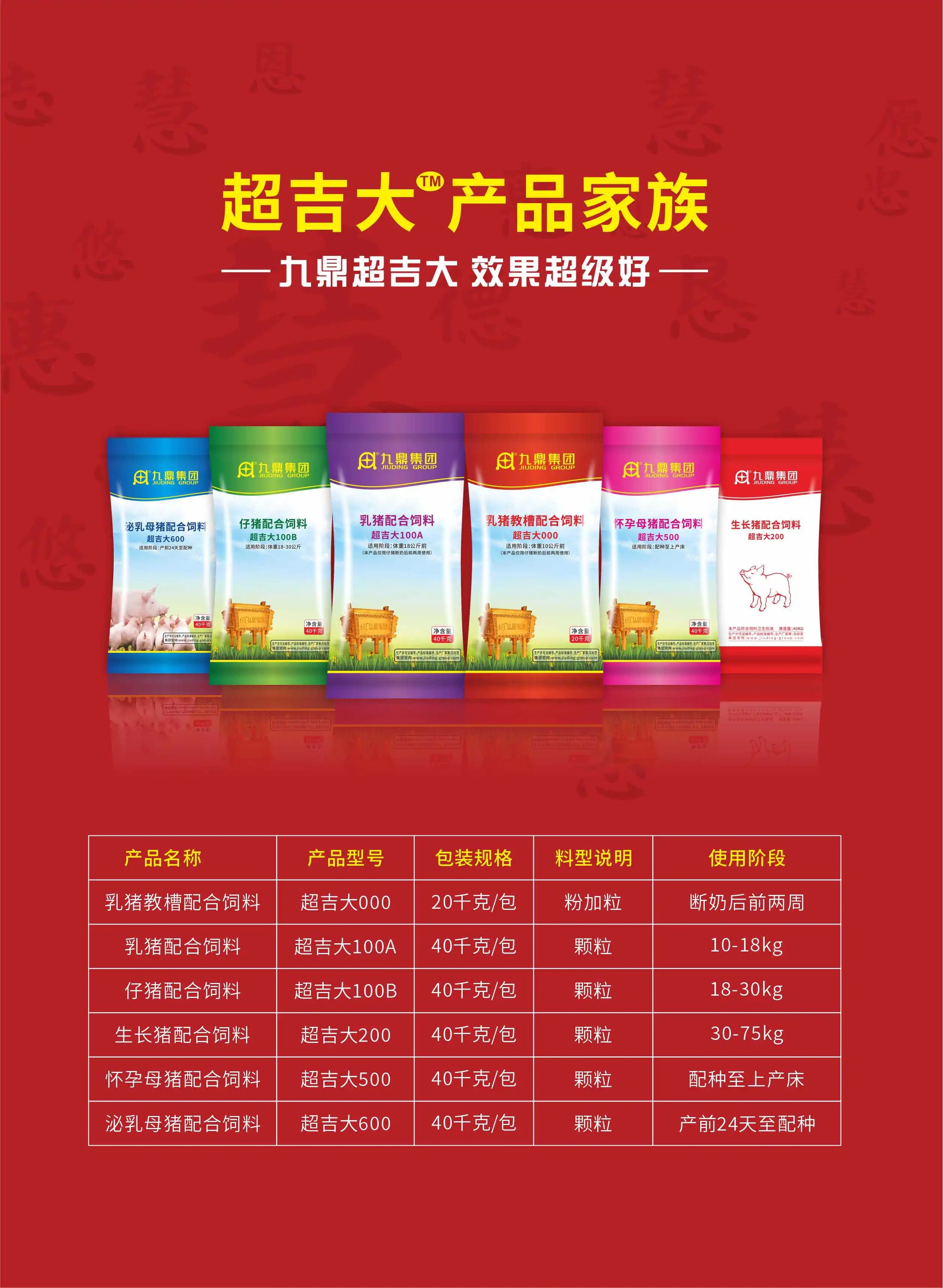 九鼎集團(tuán)扎根于豬飼料領(lǐng)域30年,深刻明白:低價飼料并不能真正幫助養(yǎng)豬實(shí)現(xiàn)盈利或減少虧損,飼料企業(yè)更應(yīng)該做的是提供好的飼料,讓豬場飼料的投入產(chǎn)出更好才是根本。為此,九鼎集團(tuán)于2023年主張產(chǎn)品戰(zhàn)略回歸:給客戶提供高價值飼料,與客戶共渡養(yǎng)豬難關(guān)。期待超吉大產(chǎn)品獲得成功,期待九鼎集團(tuán)創(chuàng)造更加輝煌燦爛的明天!