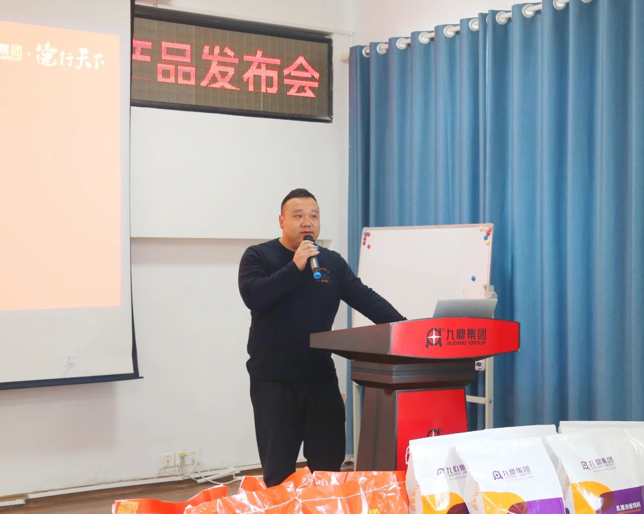 會(huì)議開(kāi)始,集團(tuán)總裁喻文鋒先生、副總裁徐波先生及參會(huì)的集團(tuán)領(lǐng)導(dǎo)和各營(yíng)銷(xiāo)公司總經(jīng)理們一同登上講臺(tái),輕觸啟動(dòng)按鈕,隆重宣告預(yù)配料線超吉大系列新產(chǎn)品—超吉大教槽料、CJD優(yōu)乳寶、CJD仔豬寶的正式發(fā)布。