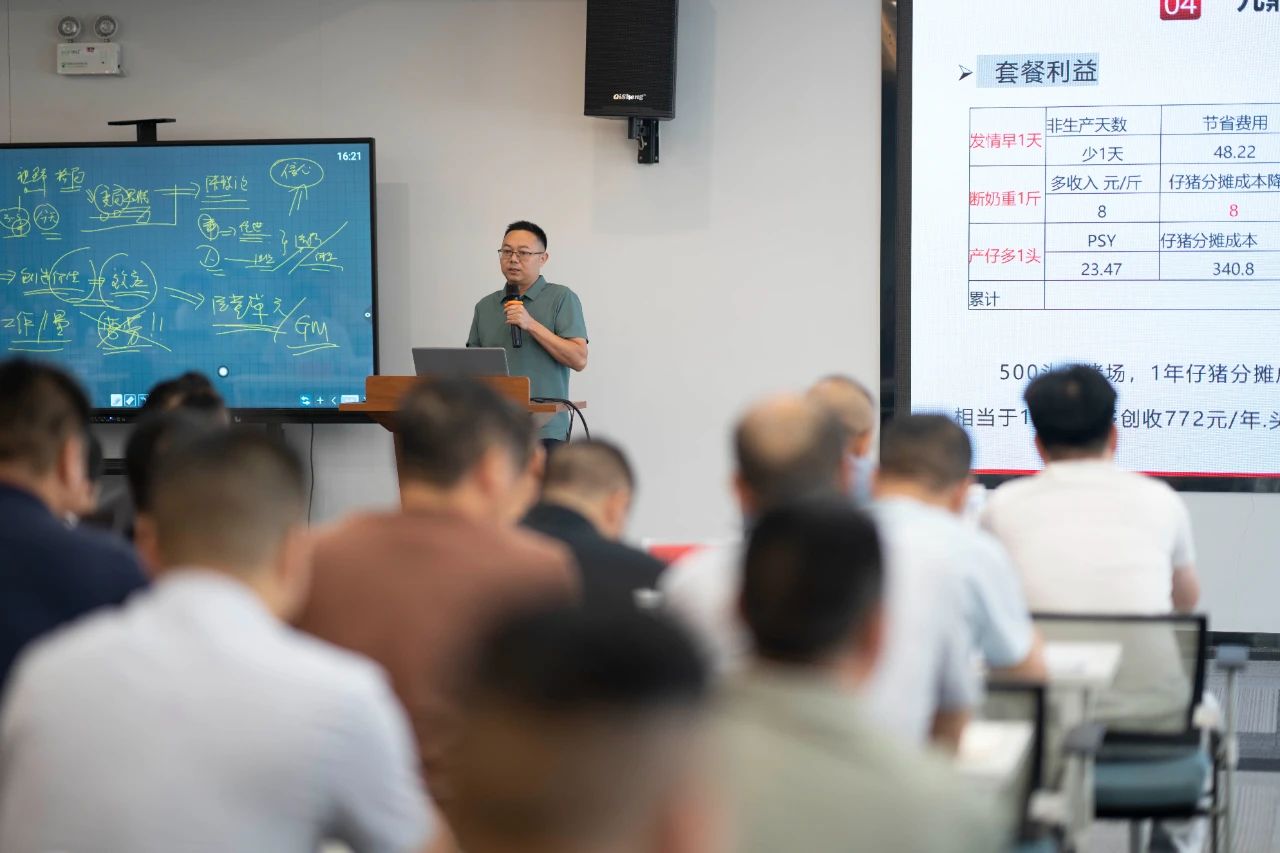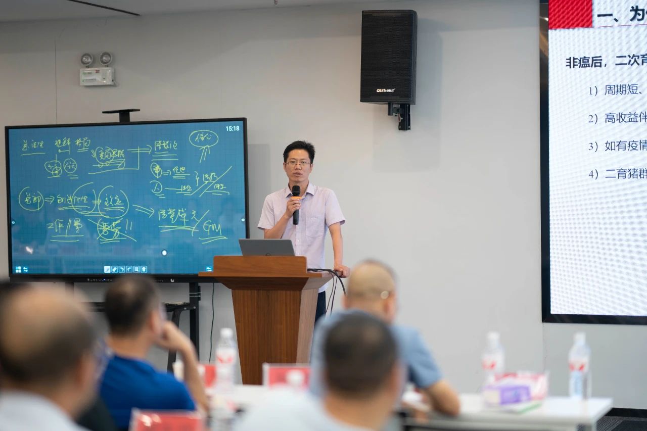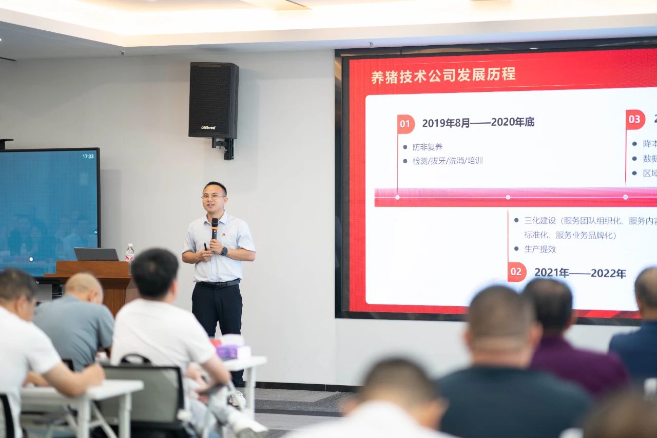 ▲集團研發(fā)中心總經理江書忠介紹了《家庭農場養(yǎng)豬E平臺》和《通過體況管理提升母豬生產成績》
